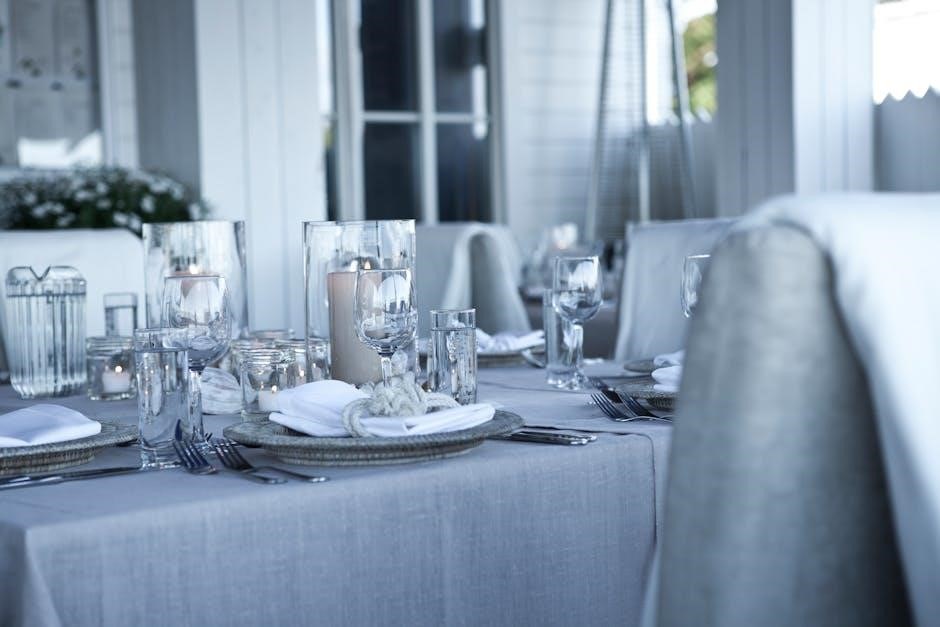 When selecting table linens, consider the occasion to ensure the right fit and style. For formal events, opt for a longer drop, adding 4-6 inches to the standard size for an elegant look. Casual gatherings may require less overhang, so subtract 2-4 inches for a relaxed vibe. Weddings often use floor-length linens, while outdoor events may need adjustments for uneven surfaces or wind; Measure tables with decorations or centerpieces to avoid interference. Adjusting linen sizes based on the event ensures a perfect balance of functionality and aesthetics, creating a seamless experience for any setting or celebration.